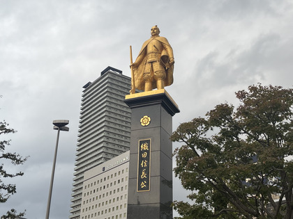 岐阜駅前の金ぴか信長像。