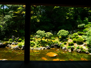 夢窓疎石作の庭園と宝物館は、拝観料(400円)を払えば見学できます。池の上に浮かんでいるように見えます。