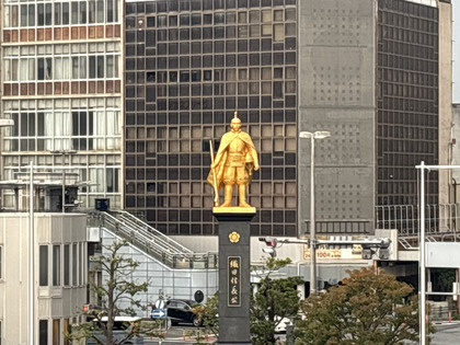 岐阜駅前の金ぴか信長像。